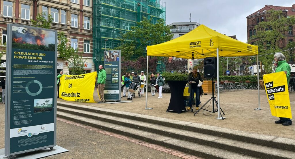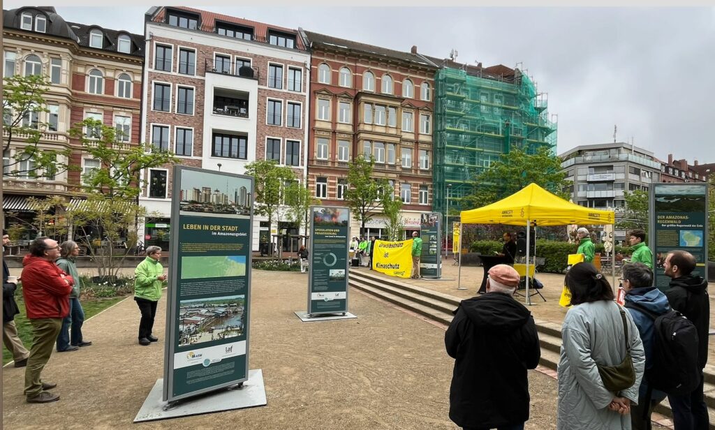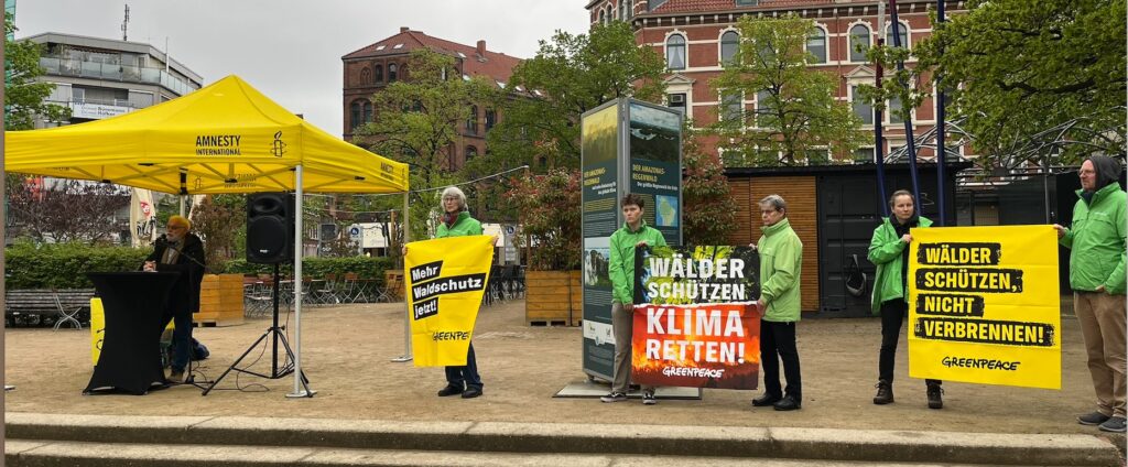 Anlässlich der diesjährigen Hannover-Messe mit dem Partnerland Brasilien hat Amnesty International Hannover am Sonntag, den 19.04.2026 die Ausstellung „Amazonien – Der größte Regenwald und wir“ auf dem Weißekreuzplatz eröffnet. Mit dieser Aktion richtet Amnesty International den Blick auf eine der ökologisch und menschenrechtlich wichtigsten Regionen der Welt: den Amazonas-Regenwald.