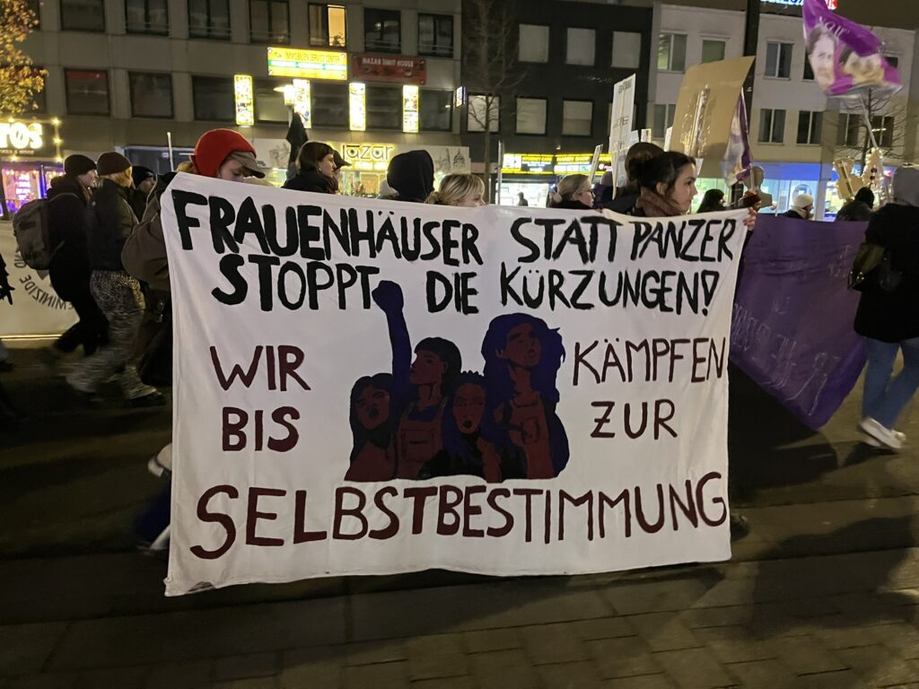 Anlässlich des Internationalen Tages gegen Gewalt an Frauen* und Mädchen haben mehrere feministische Initiativen in Hannover für Selbstbestimmung und demokratische Autonomie zum Protest aufgerufen – laut, entschlossen und solidarisch. Gemeinsam machten sie unter der Parole „Frauen*häuser statt Panzer! Stoppt die Kürzungen!“ deutlich, dass patriarchale, staatliche und strukturelle Gewalt kein Randphänomen, sondern ein globales System der Unterdrückung ist, das beendet werden muss.
